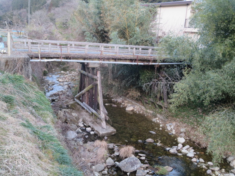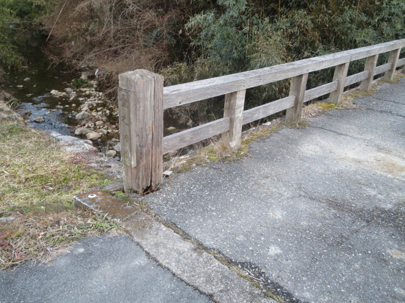 木造の橋。欄干の根元が腐り浮いてます。