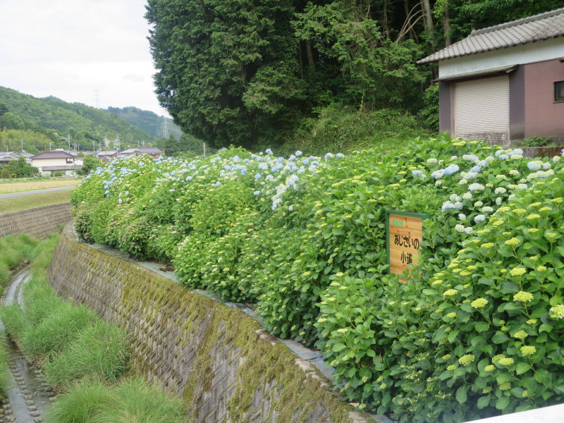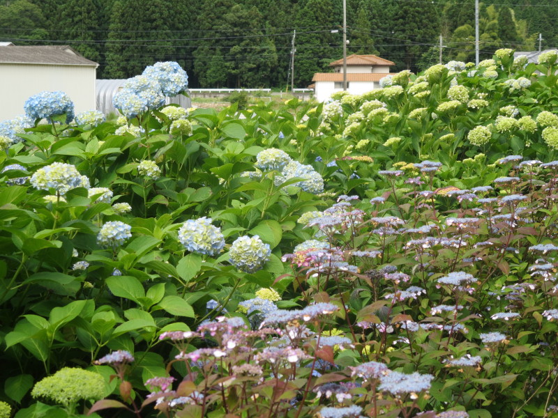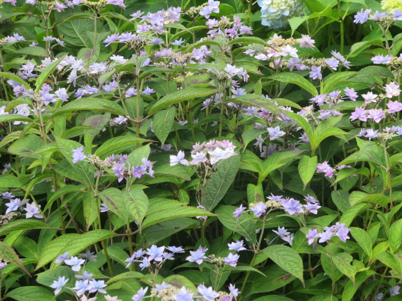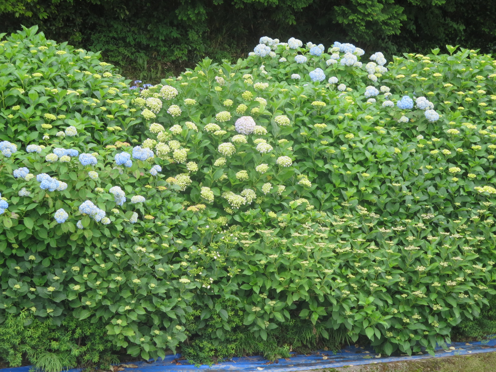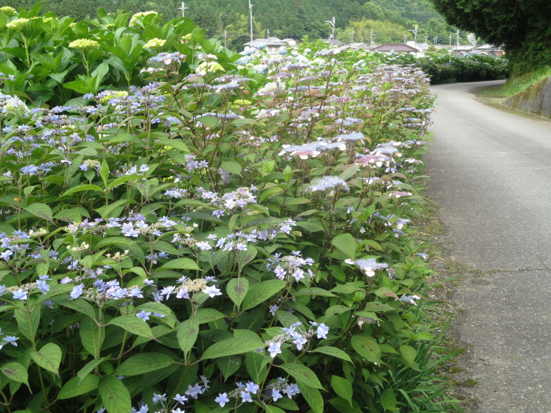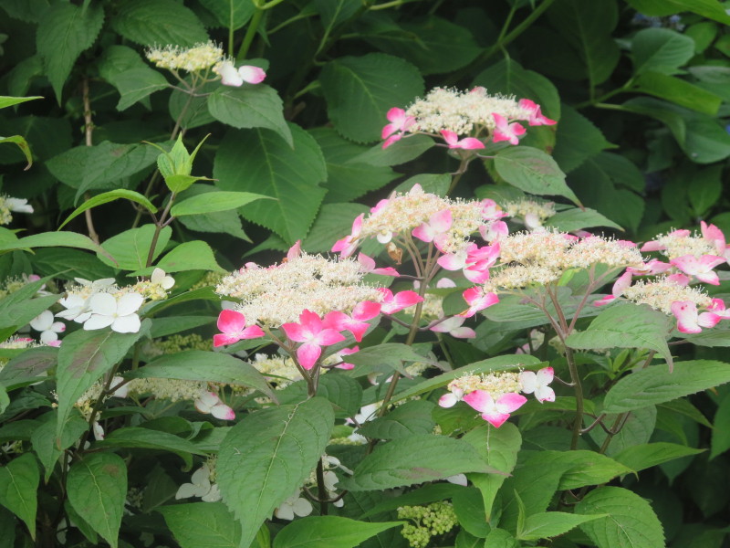 正面は今からですが道路沿いの山アジサイが20種ほど満開です。