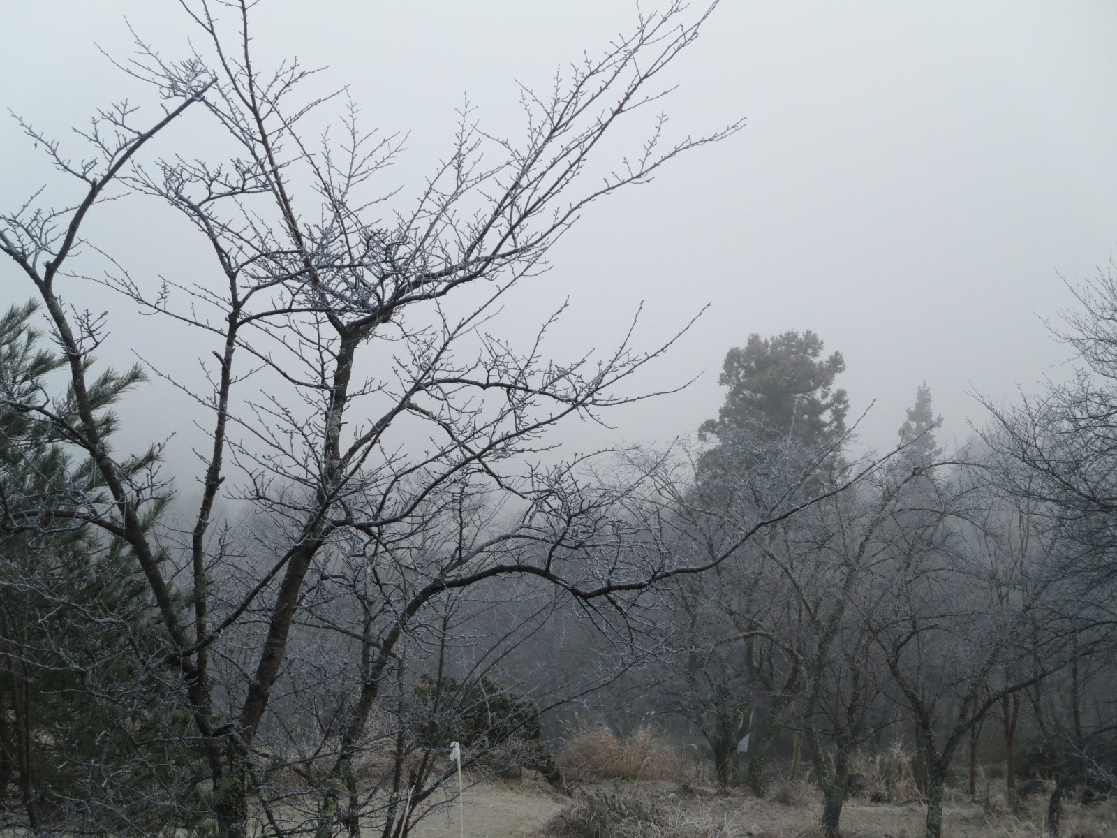 第3展望所は霧の中、桜の枝も霜がビッシリ。