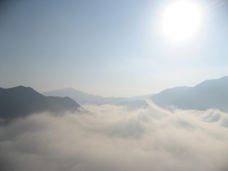 四方一面の雲海。雲海に城の影が映る。先程まで居た立雲峡から沸き立つ雲が逆光で輝く!。まさに立雲峡!!。北側は海に浮かぶ島のように山々が雲海の中に突き出す光景はまさに息を呑む絶景、言葉も無い!