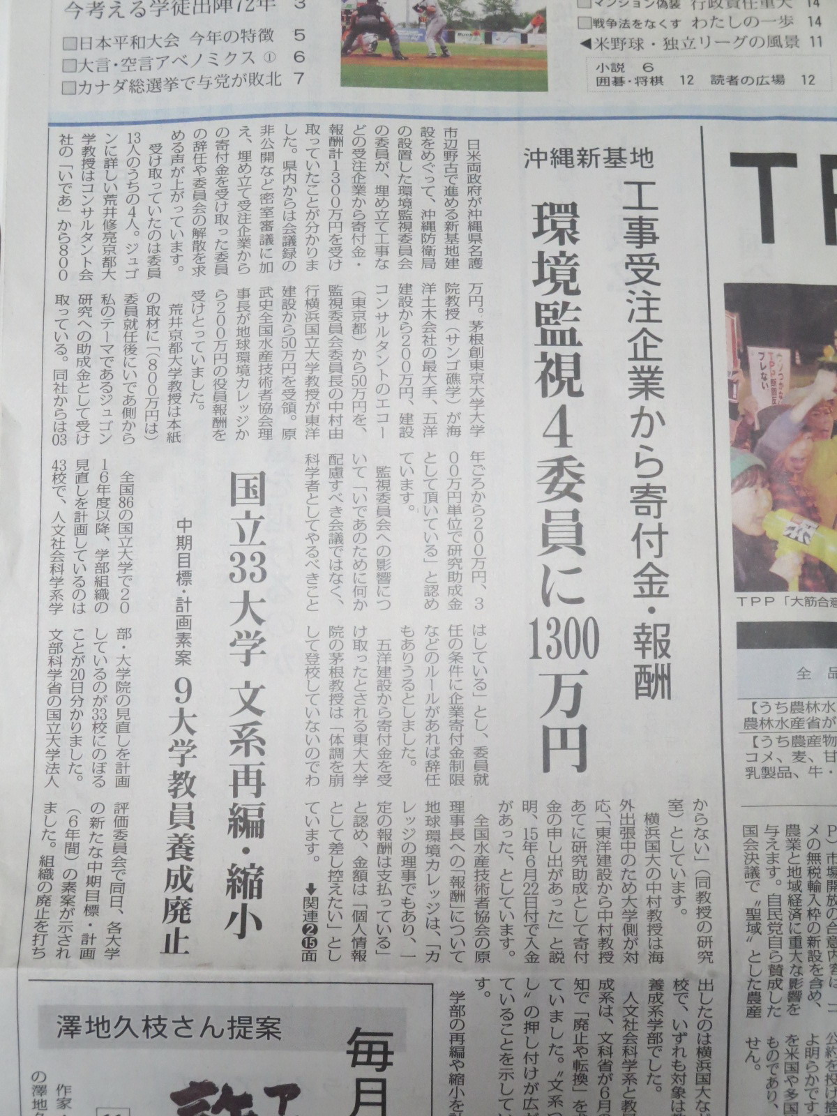 21日、今朝の「赤旗」1面記事