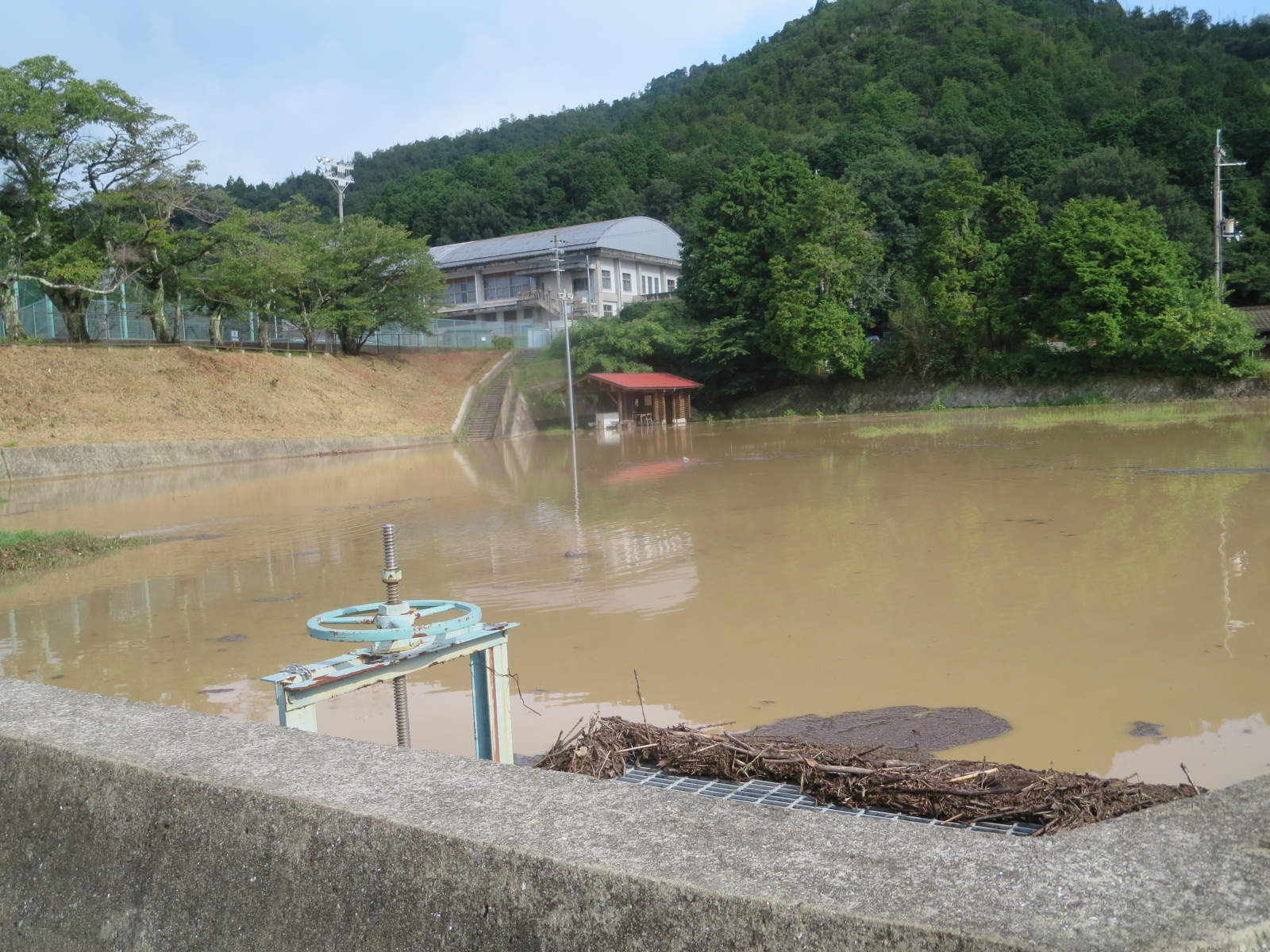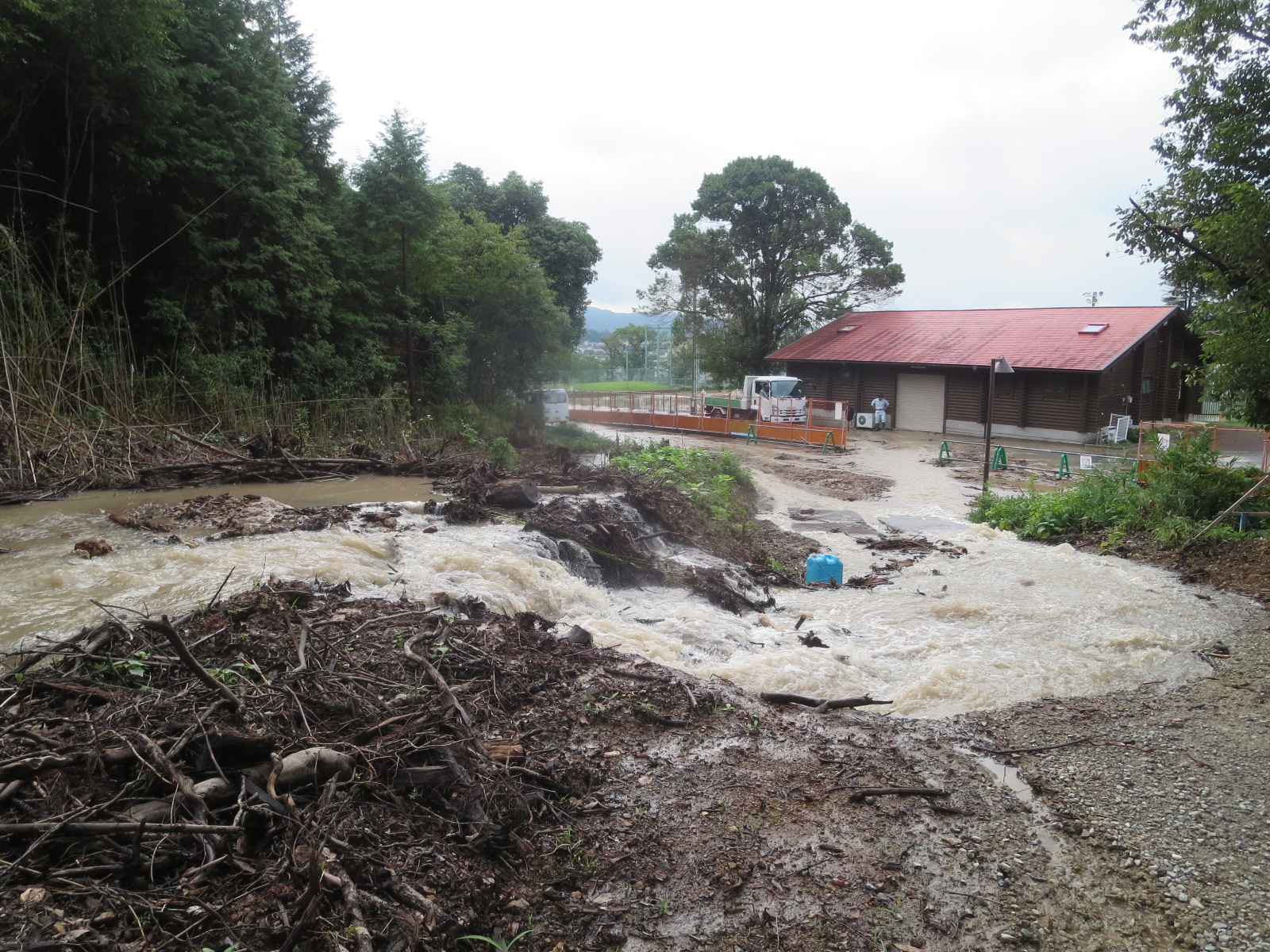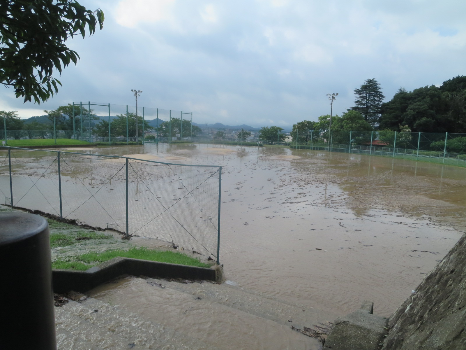 スポーツ公園上の防災工事現場からの出水でグランドは池状態。