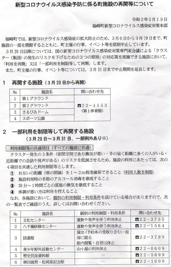 福崎町は3月20日からの施設の利用について次の方針を示しました。