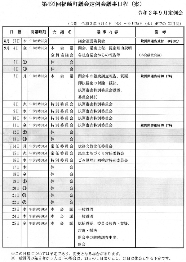9月定例議会の日程(案)が決まりました。