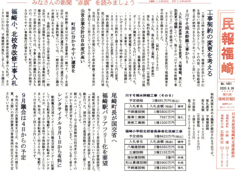 8月21日の民生まちづくり常任委員会で議論のあった工事契約問題について、民報福崎で報告することとしました。