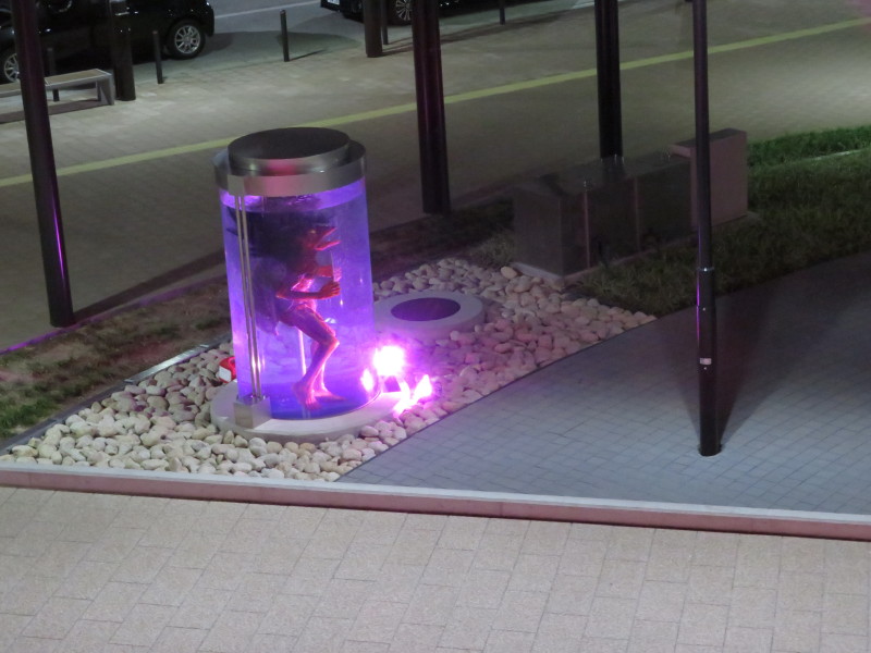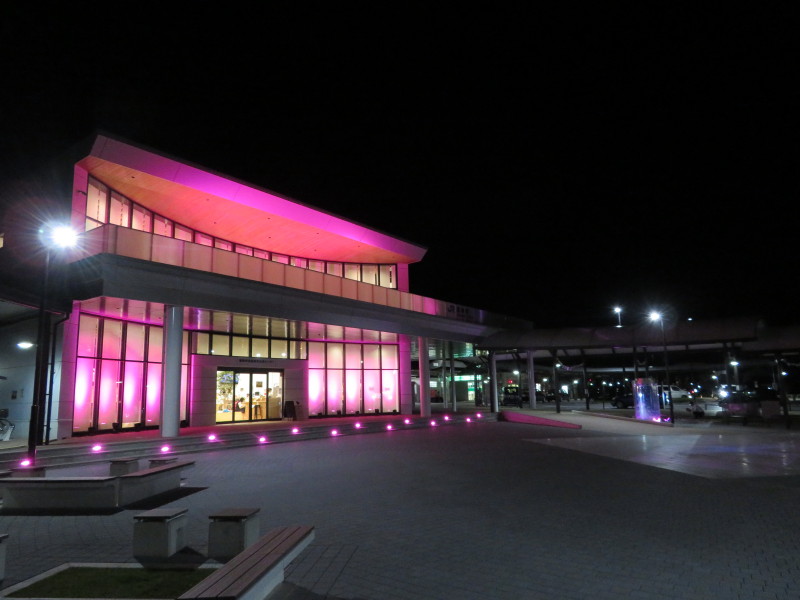 10月1日、ピンクリボンデー、福崎駅前の交流センターが輝いています。