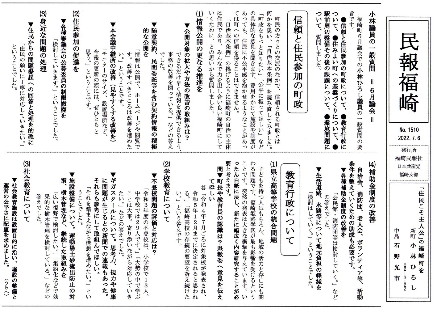 この春以降、町行政の政治姿勢を問われるような問題を複数感じました。