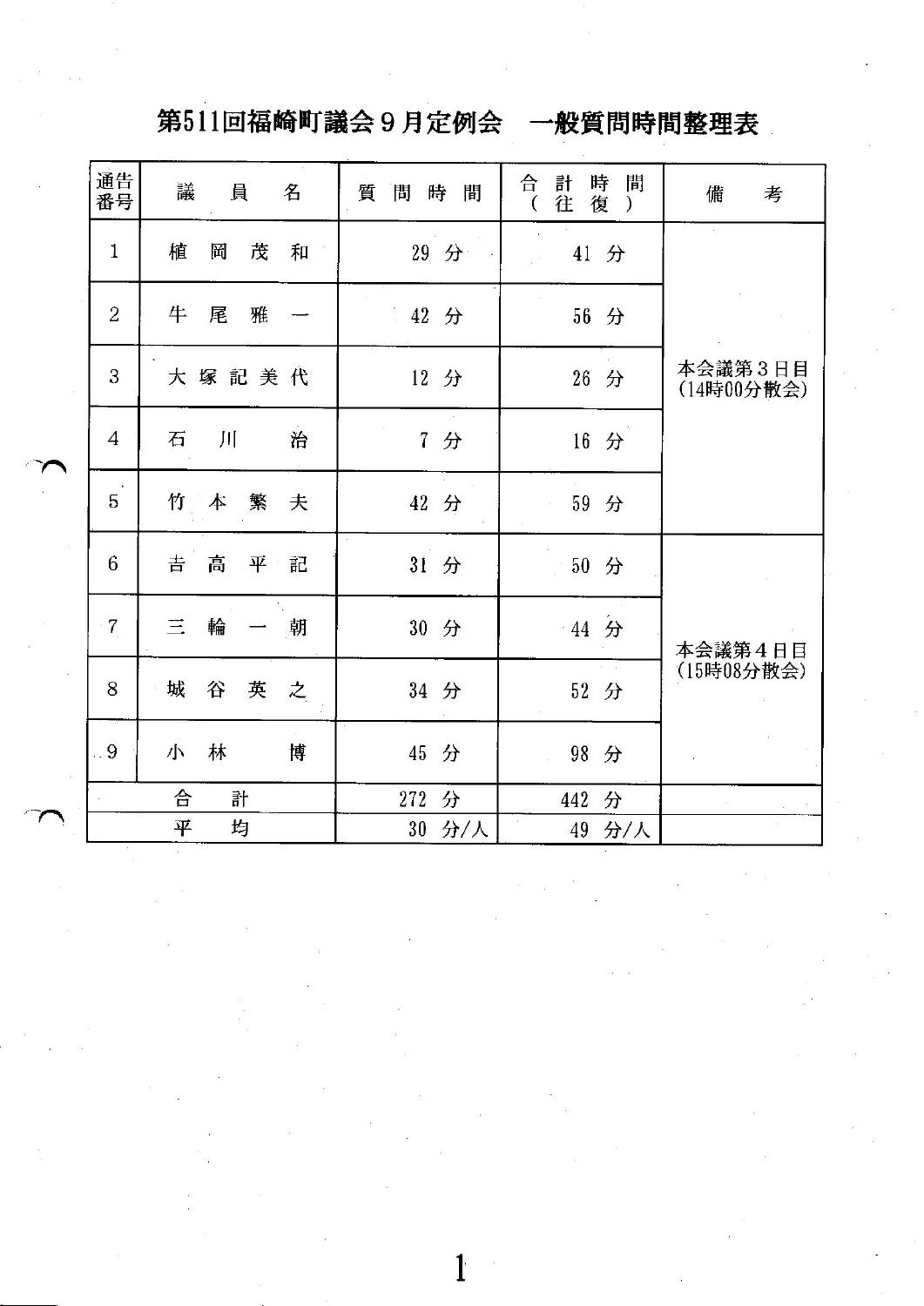 9月定例議会の一般質問時間の整理ができました。