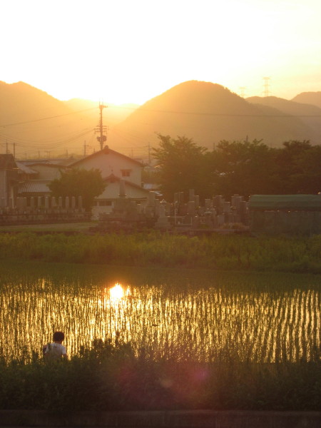 田んぼに映った夕日