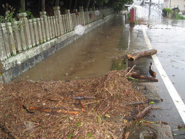 いつもの危険箇所、福田の神社前の溢水です