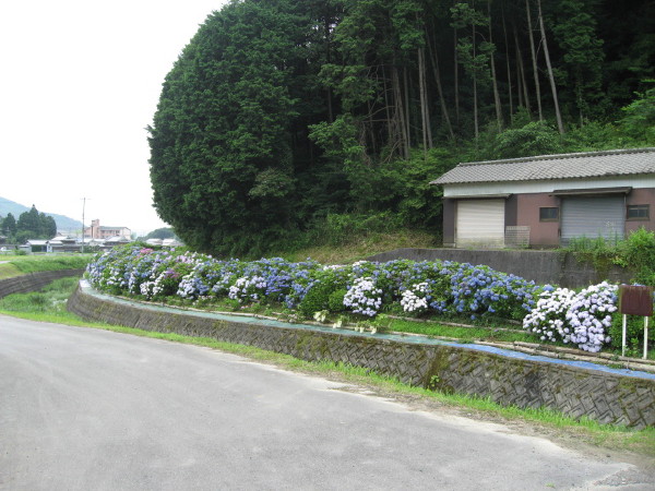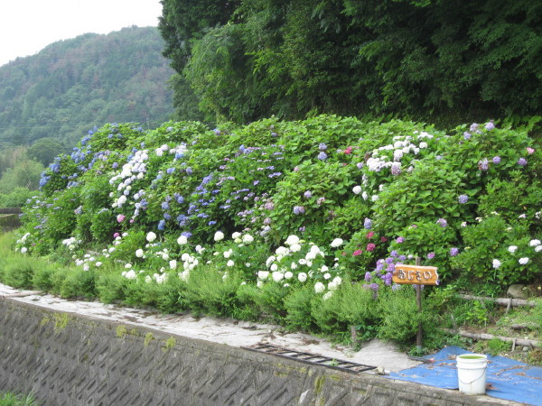自然歩道の板坂区域・・三谷川沿いでアジサイが今年も咲きそろっています