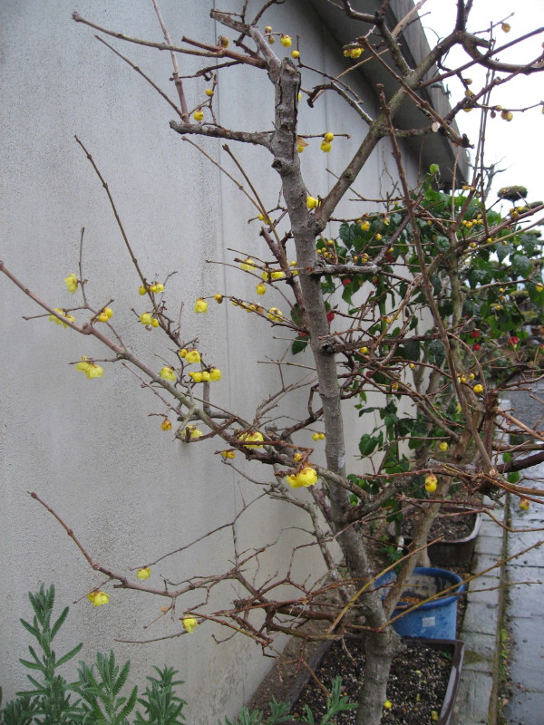近くの家の庭に黄梅が咲いていた。