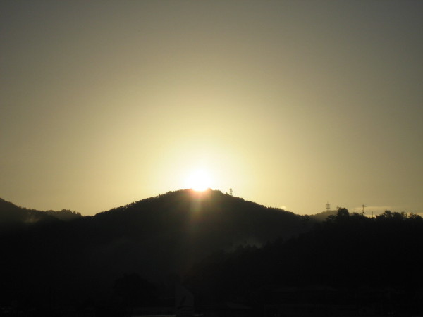 18日朝、日光寺山に日の出、河川公園から