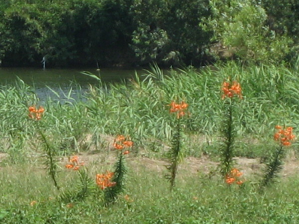 市川河川公園横の中州ではたくさんの鬼百合が咲いています