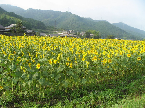 16日朝、ひまわり畑、そばでは稲も頭を垂れかけていました