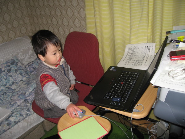爺のおもちゃを触る1歳と6ヶ月を迎える諒