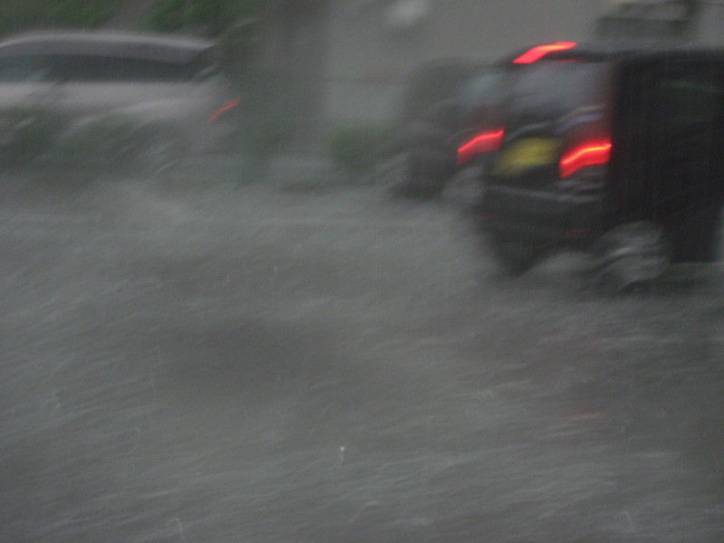 消費税引上げは当然と主張する講演会の直後、突然の雷と雹に見舞われた。