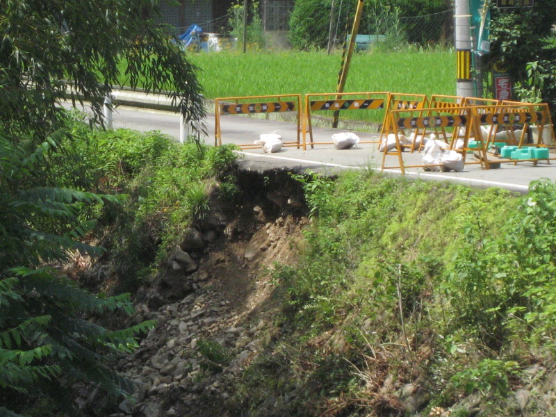 野外センター周辺の遊歩道整備で作られた駐車場部分の決壊現場。
