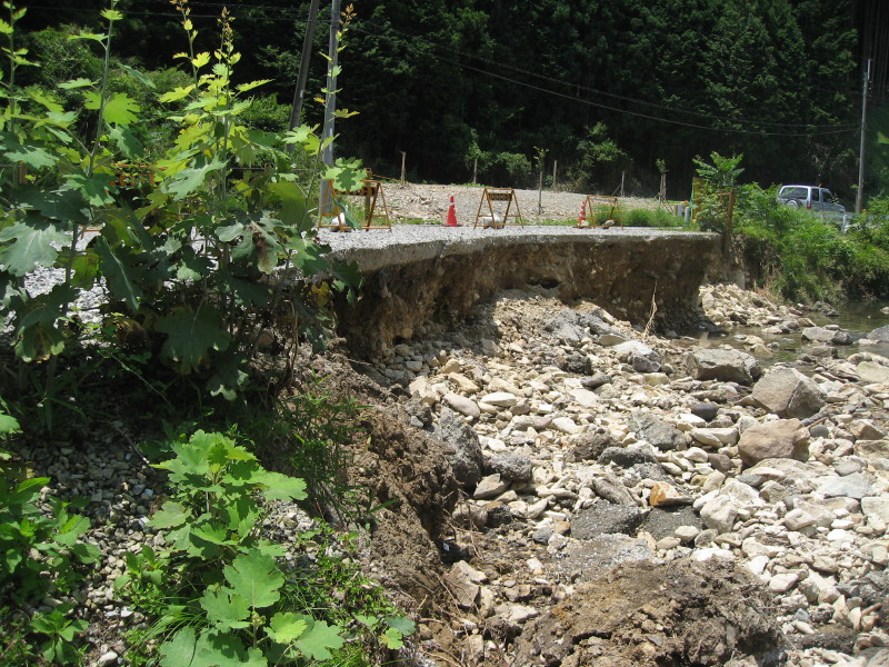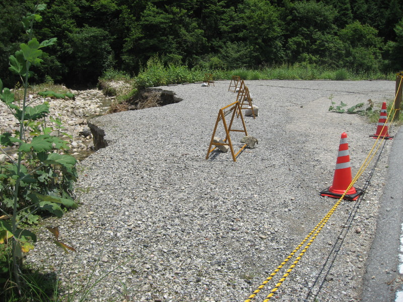 七種川の金剛橋横の現場、道路不通。早い復旧が求められている。