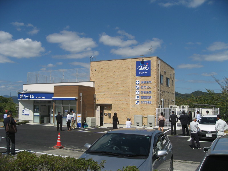 病院の駐車場入り口に薬局が完成し、式典のような雰囲気です。