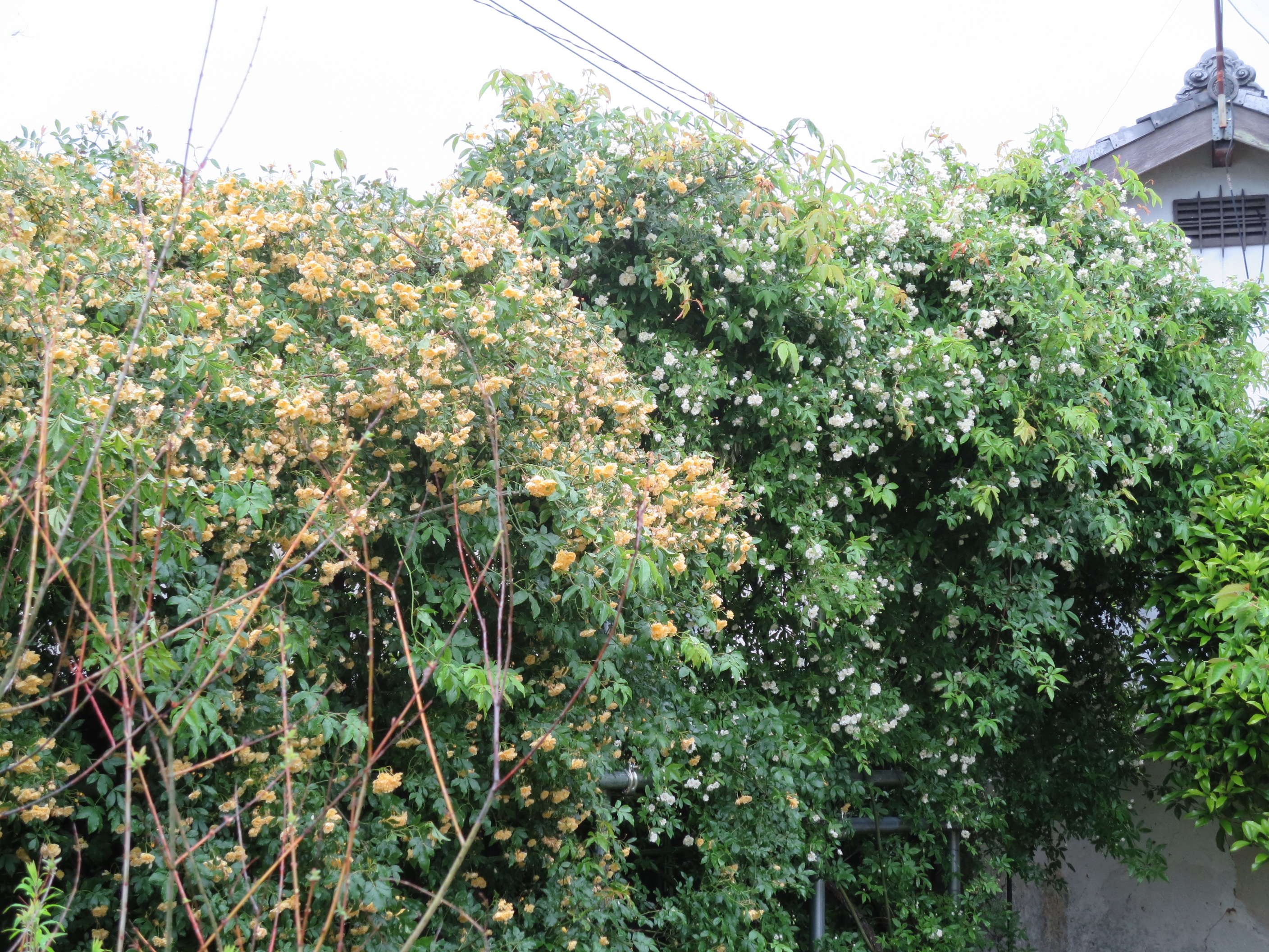 モッコウバラです。白と黄色が並んでいます。