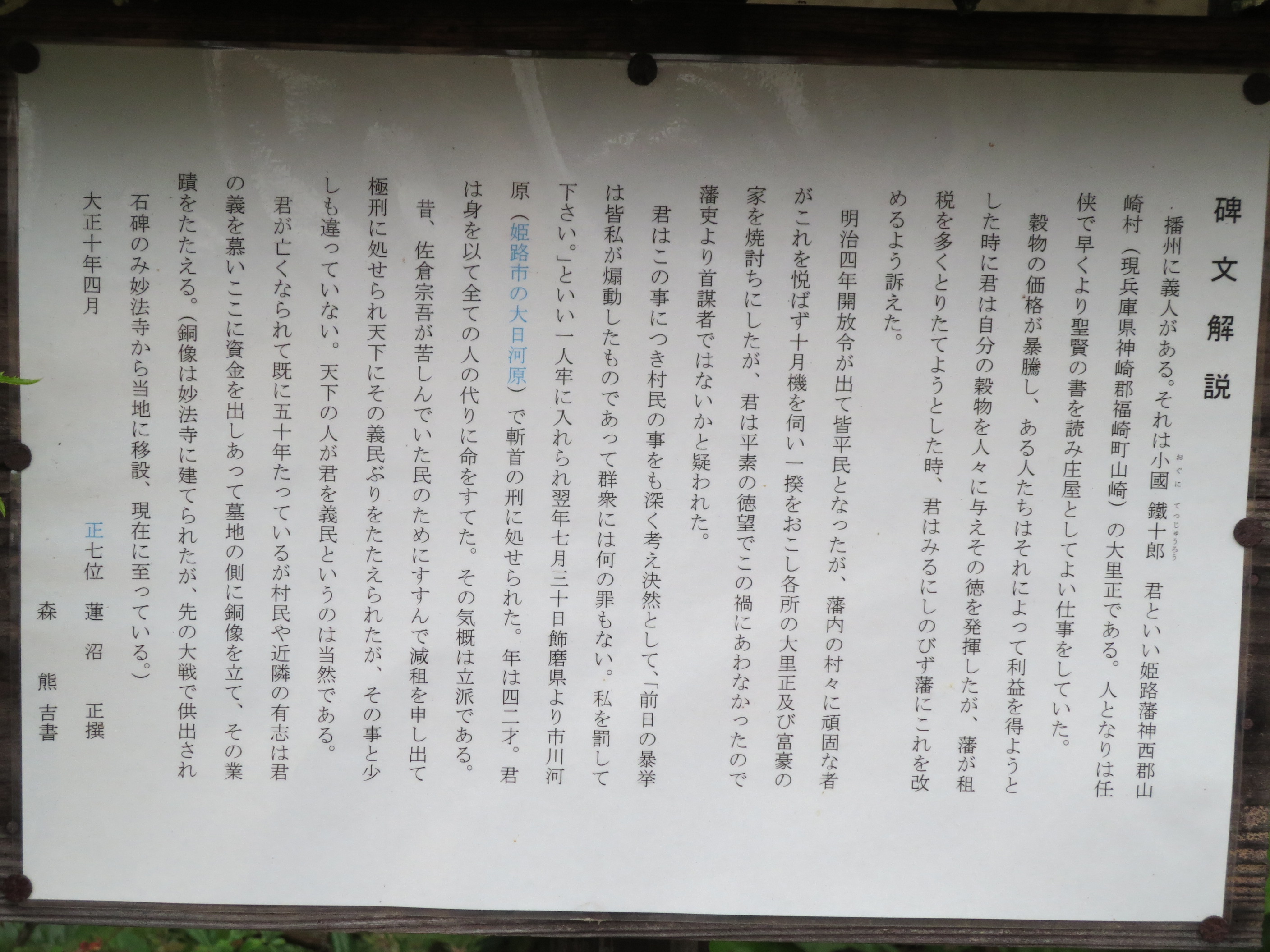 小國鐵十郎の記念碑とその説明文です。