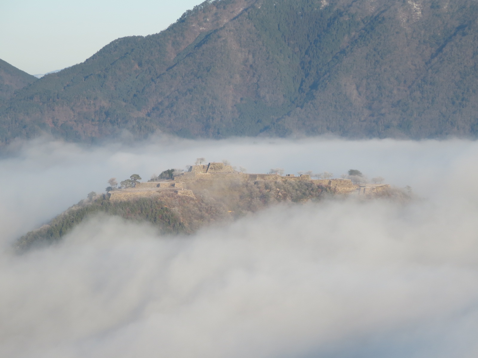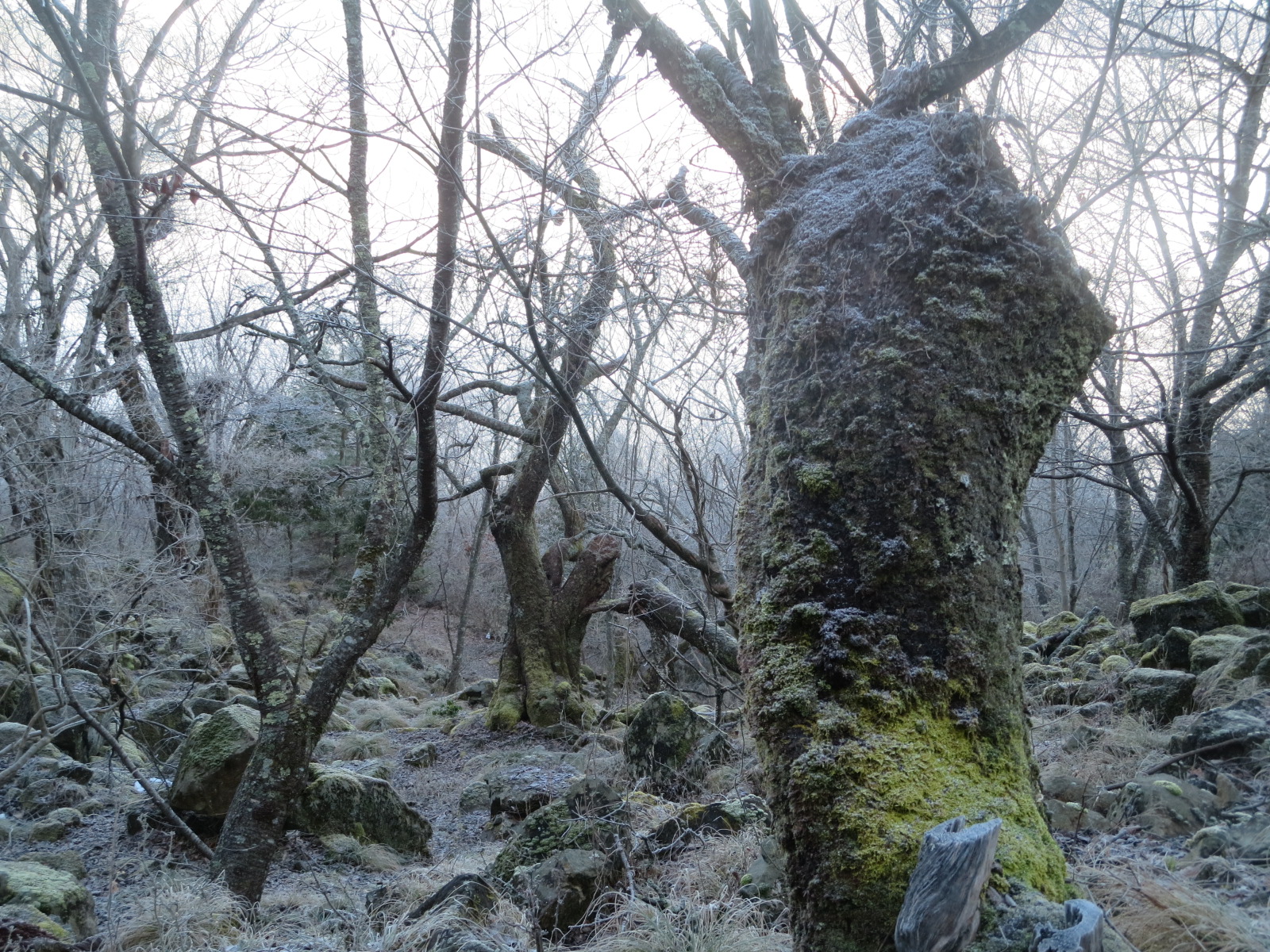 第3展望所は霧の中、桜の枝も霜がビッシリ。