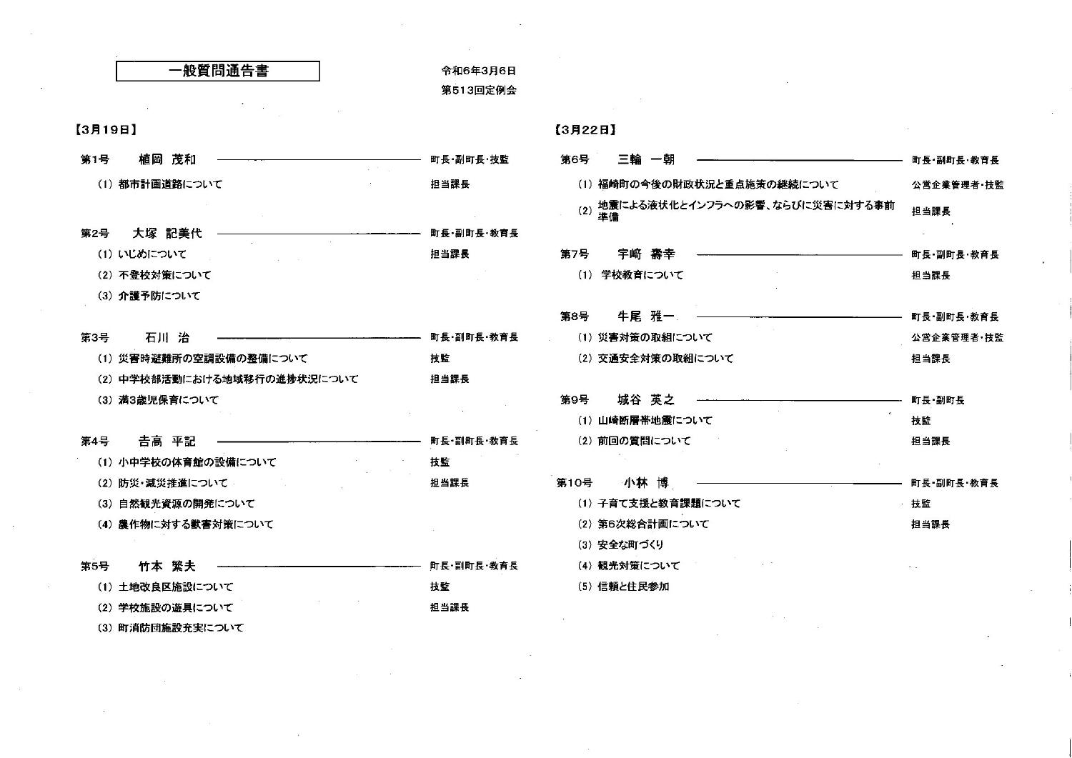 2024、3月定例議会の一般質問には9名が立ちました。