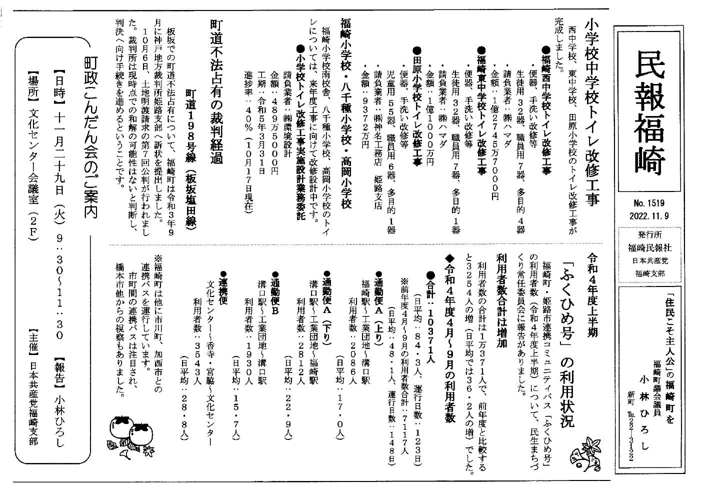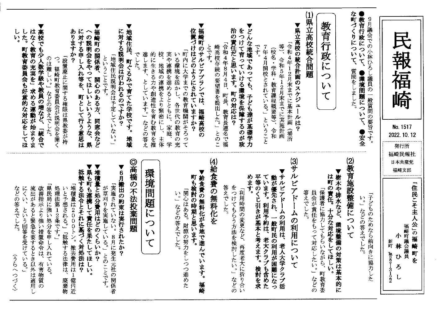 9月議会の一般質問では高校統廃合問題と社会教育施設の公平利用、