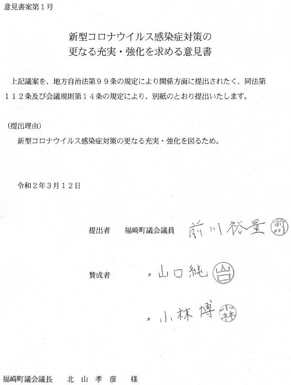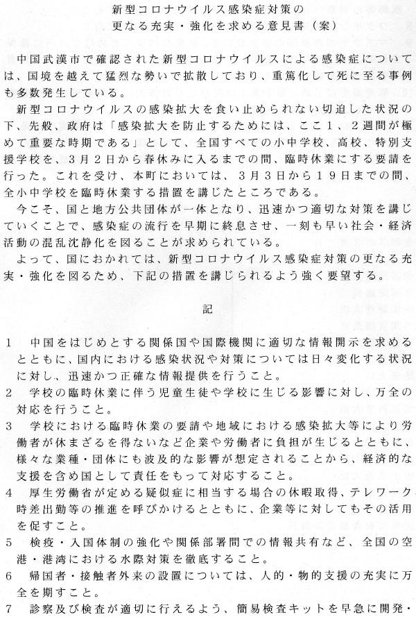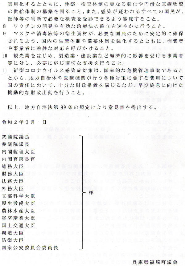 3月12日、福崎町議会はコロナ対策で意見書を決議しました。