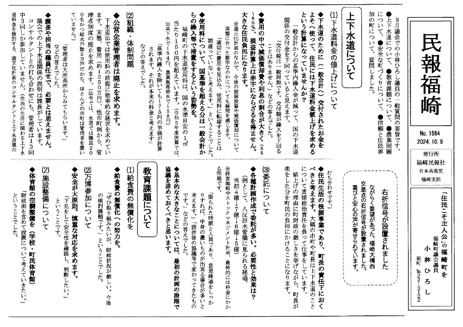 9月定例議会の一般質問の報告民報がようやくできました。